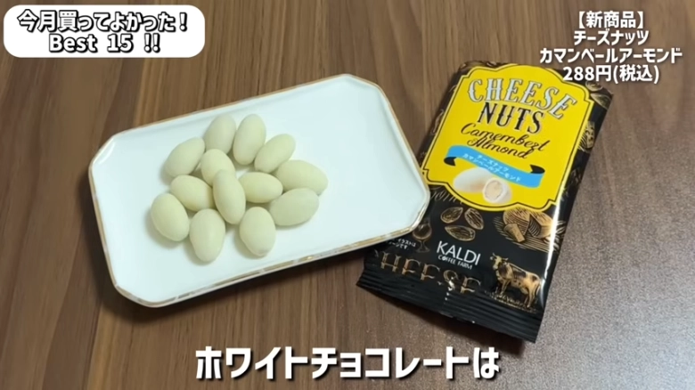 13粒入りで、アーモンドにコーティングされたホワイトチョコレートには濃厚なチーズパウダーが加えられています!ホワイトチョコレートといっても甘さはほぼなく、カマンベールチーズの香りとコクが感じられてとてもおいしい♡アーモンドのザクザク食感とチーズのバランスが最高で、ワインのおつまみにもよさそうです♪