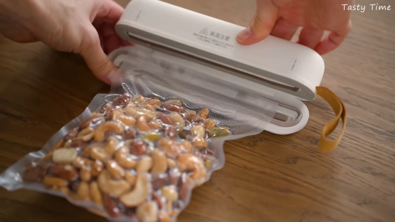 ミックスナッツは、スイーツ作りやサラダ、お酒のおつまみなどに合う万能な食材。そのまま保存しておくと味や香りが徐々に損なわれていってしまうので、真空パックで密閉して冷凍保存するのがおすすめです。Tasty Timeさんはこういうときのためにsusealの「コードレス真空パック機」を愛用しているそう。