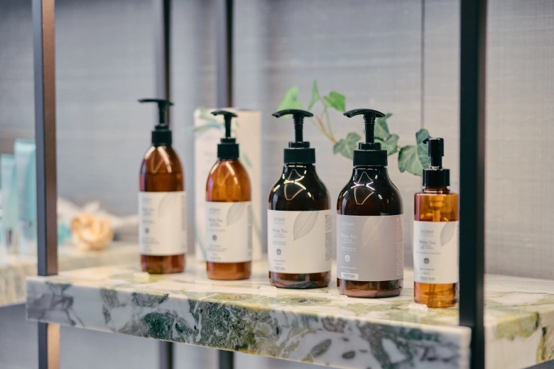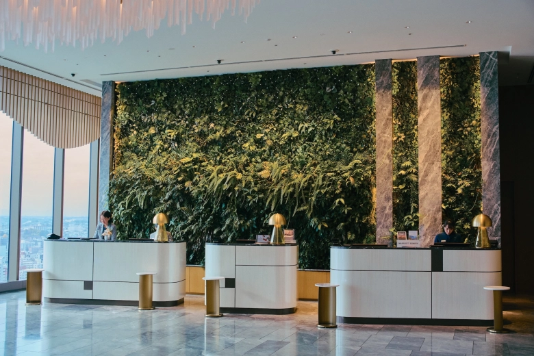 館内に足を踏み入れると、ラグジュアリーで洗練された雰囲気。緑や木目など自然由来の素材が多く使用されており、心も落ち着きます。