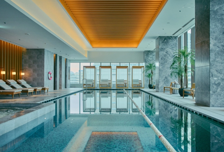 また、宿泊者限定の室内プールも完備。全長20mの広々とした空間に、ジェットバスやベッドソファも配置。温水なので、季節や天候を問わずゆっくりと楽しめます。