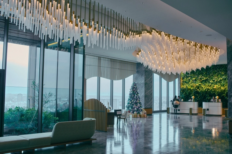 チェックイン・アウト用のレセプションフロントがあるのは23階。見晴らしが良く、ツリーや大きなシャンデリアの装飾もテンション上がります♡