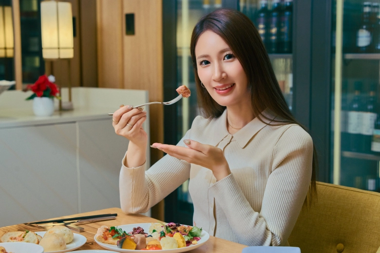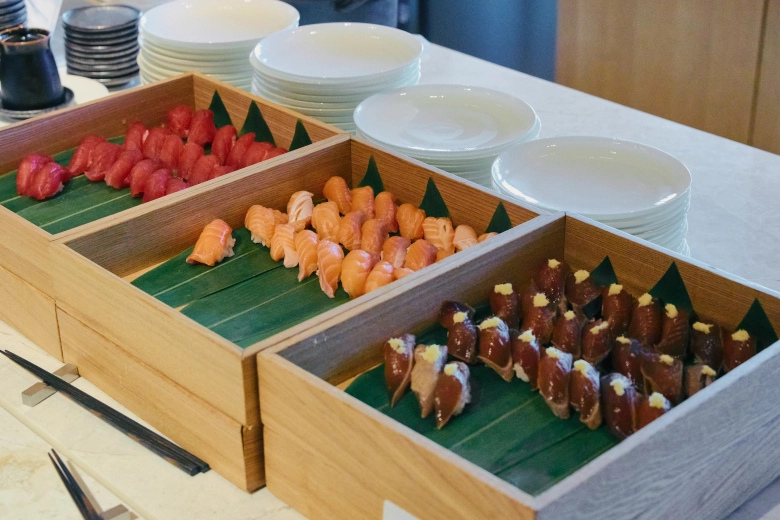 「美食の世界旅行」をテーマにした、和洋中どれも楽しめるインターナショナルビュッフェを提供。メインのビュッフェ台を始めとし、冷菜のビュッフェ台、お寿司用カウンター、スイーツビュッフェスペース、ドリンクカウンターと、大充実の内容です!かえでさんも「どれもおいしそうで目移りしますね。ついついたくさん取りすぎちゃいます。子どもと一緒に来ても好きなものをそれぞれ楽しめるので良いですね」と、大満足!