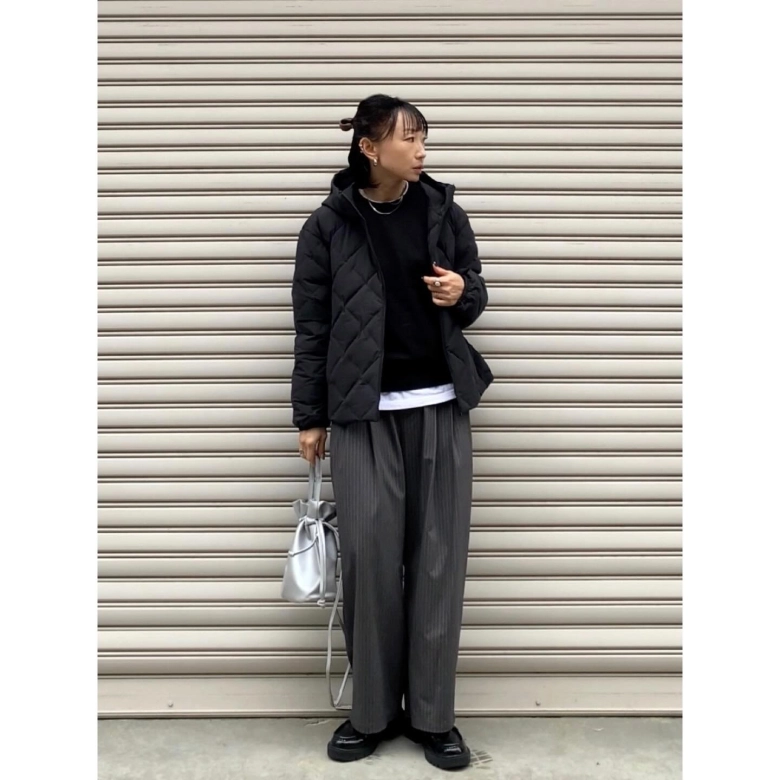 パフテックパーカは、ほどよくゆとりのあるサイズ感でありながら、中にセーターやトレーナーなどを着こんでも、着ぶくれしないシルエットがうれしいポイント。全体にキルトステッチが施されているため、カジュアルになりすぎず、上品な大人コーデにもぴったりです。@sizu_oksamさんのように、モノトーンコーデのアウターとして着こなせば、モードな空気と大人の余裕を感じられます♪