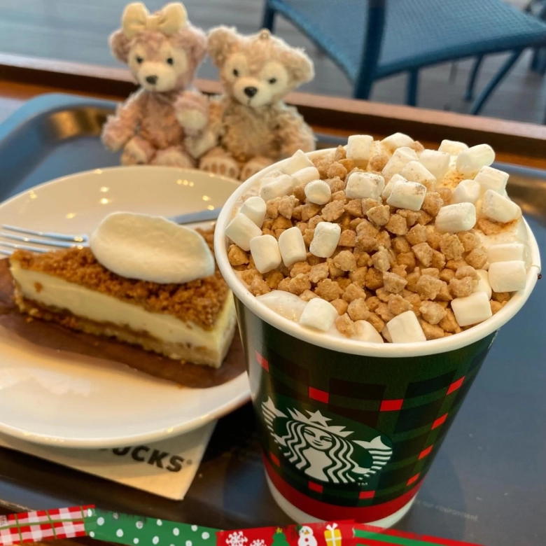 こちらはスモア チョコレート フラペチーノと同じくスモアをテーマにした、寒い日にうれしいホットドリンク。深みのあるエスプレッソとスモアフレーバーを合わせたラテに、トッピングのマシュマロがじんわり。全粒粉クランチの食感もアクセントを添えます。香ばしさと優しい甘さが広がり、ホリデー気分を盛り上げてくれる一杯です。