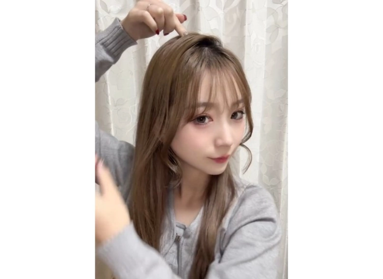 - 7の方の毛束を耳の後ろの位置でさらに分け、後方の毛束を仮留めする