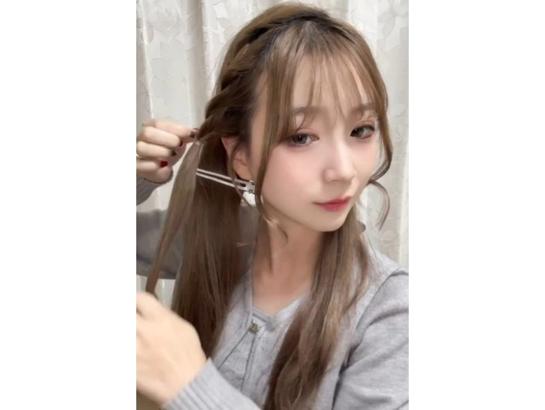耳の後ろくらいの位置で縦に2つに割ってください♪