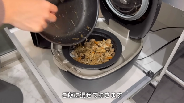 から揚げなどのおかずとしてもよく登場する鶏もも肉ですが、混ぜご飯の具材にもぴったり♪先ほど紹介したえのきやごぼう、油揚げといったお好みの具材を調味料で煮詰めて、炊き立てのご飯に混ぜるだけです。炊き込みご飯よりも味がしっかりとしているので、ayaさんもお気に入りのメニューだそう♡