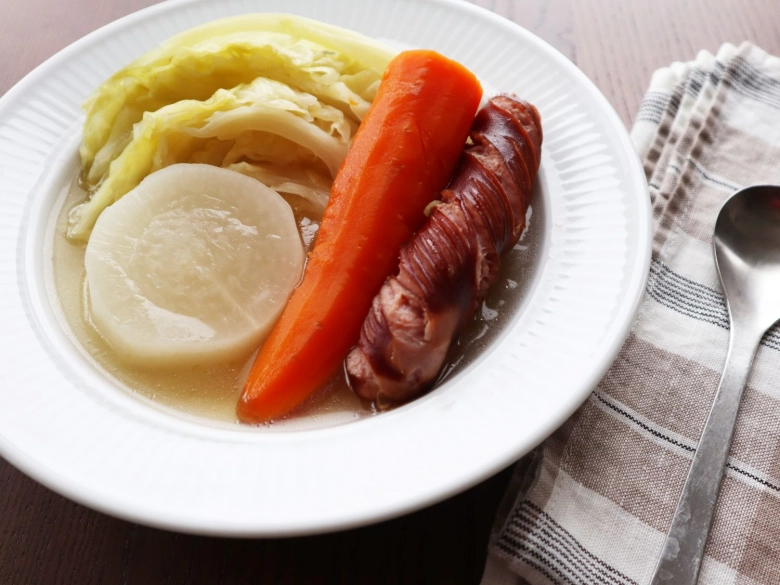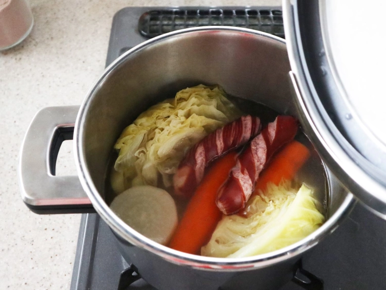 『マイヤー ハイプレッシャークッカー4.0L』は国内最⾼クラスの圧⼒で、「丸ごとにんじんのポトフ」が加圧時間10分で作れます。スプーンが吸い込まれるほど柔らかいにんじん、とろけるキャベツ、じゅわ〜とした⼤根。野菜の⽢みが染み込んでボンってしてしまった(笑)フランクフルト。シンプルだけど最⾼の煮込み料理が短時間でできるタイパ賢⼈道具、それが圧⼒鍋です。