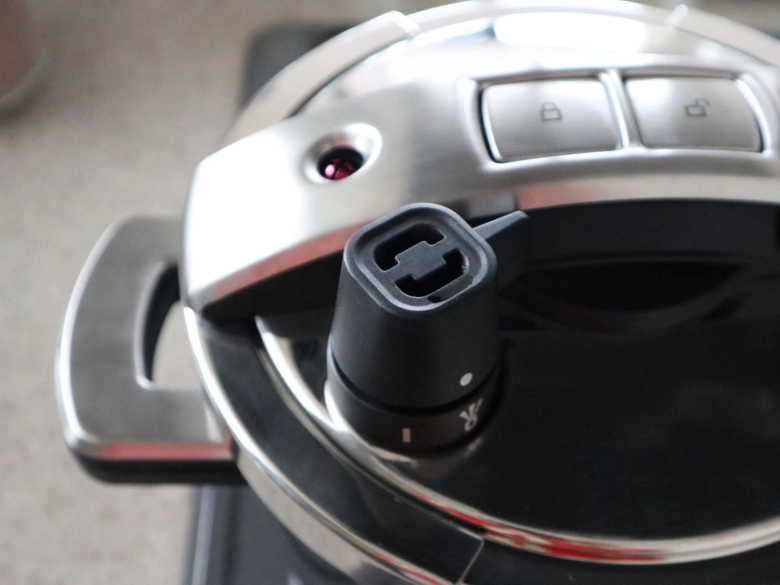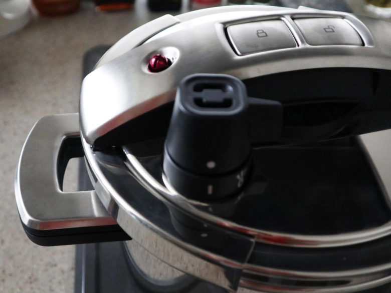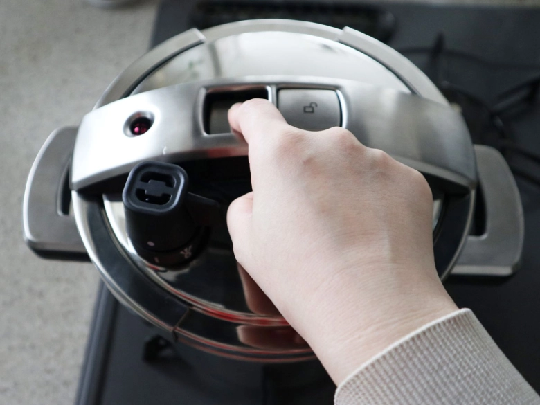 蓋を閉めたら中⽕にかけ、圧⼒調整バルブのマークを加圧マークに合わせます。しばらく加熱すると、レッドセーフティバルブがポコっとでっぱり、圧⼒調整バルブから蒸気が出始め、加圧調理が始まります。弱⽕で加圧調理をし、⽕を止め⾃然放置します。レッドセーフティバルブが完全に下がったら、圧⼒調整バルブを減圧マークに合わせて鍋の内圧がかかっていないことを確認し、オープンボタンを押すとクランプが広がり蓋を開けることができます。