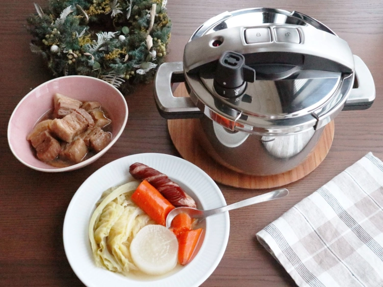 圧⼒鍋はシューシューという⾳が怖いイメージでしたが、最近の圧⼒鍋は驚くほど静かに進化していてびっくりしますよ。にんじんや⼤根などいつもの野菜も、⼤きさが⼤きいだけで⾷感も変わり、⽢みが増しているように感じます。この圧力鍋を使っていると、賢い愛情料理のレパートリーを増やしていく実験みたいで楽しくなってきますよ。