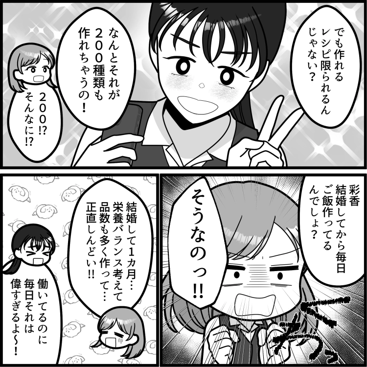 彩香は1カ月前に結婚したばかり。新婚でいつも夫が手料理を喜んでくれるため、毎日手の込んだ料理を作っていた。しかし、仕事をしているため、最近は時間をかけて料理することが大変になってきていた。そんなある日、同僚の奈央子から電気圧力鍋をおすすめされて、興味を持つ彩香。少しでも料理の負担を減らすため、夫に電気圧力鍋を購入しないかと相談するが、なんと夫からは信じられない言葉が返ってきた!?