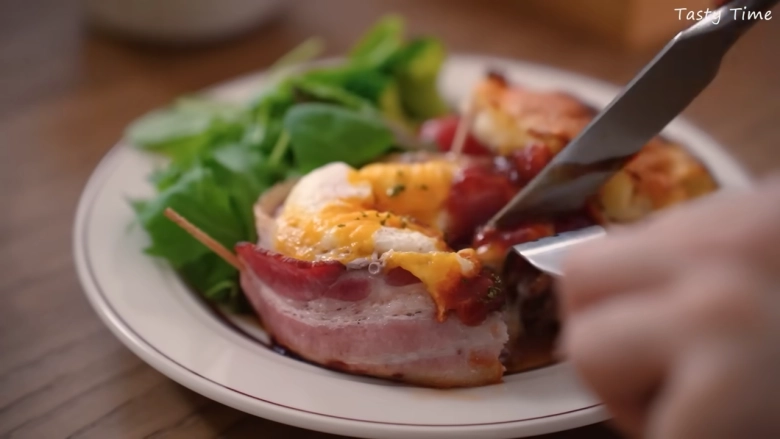 TastyTimeさんは、肉汁たっぷりなベーコン巻きハンバーグにアレンジ♪丸くまとめたひき肉をくぼませてたまごを落とし、まわりにぐるっとベーコンを巻いて焼くだけです。チーズをトッピングすると、より豪華な一皿に!