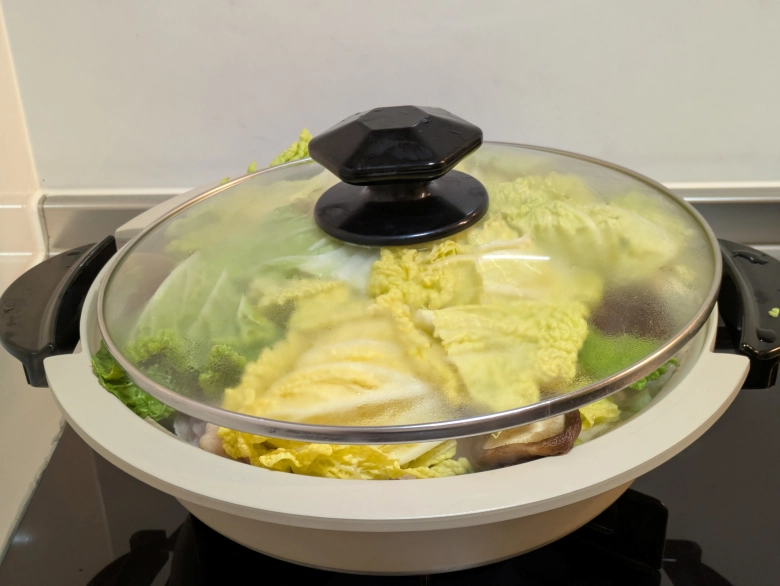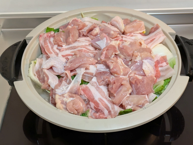 最初は具材が多く、蓋が閉まっていないので大丈夫かなと思うかもしれませんが、煮込んでいるうちに白菜がクタクタになるので問題なし!そして火が通った白菜はキレイなオレンジ色に♡