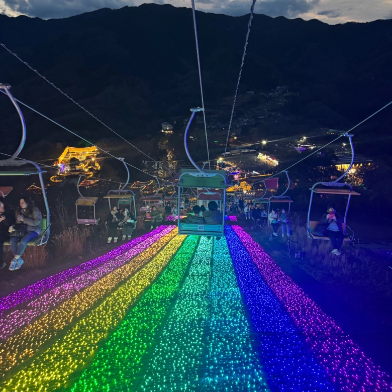 日中に乗ったリフトも、夜はライトアップされてガラッと雰囲気が変わっています。