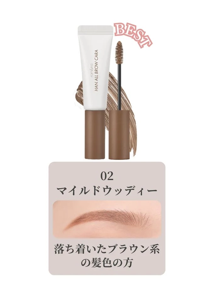 『rom&nd(ロムアンド)』のなかでも人気の高い「ハンオールブロウカラ」は、眉毛本来の質感をそのままに、トレンドの抜け感のある美しい眉に仕上げられる眉マスカラです。