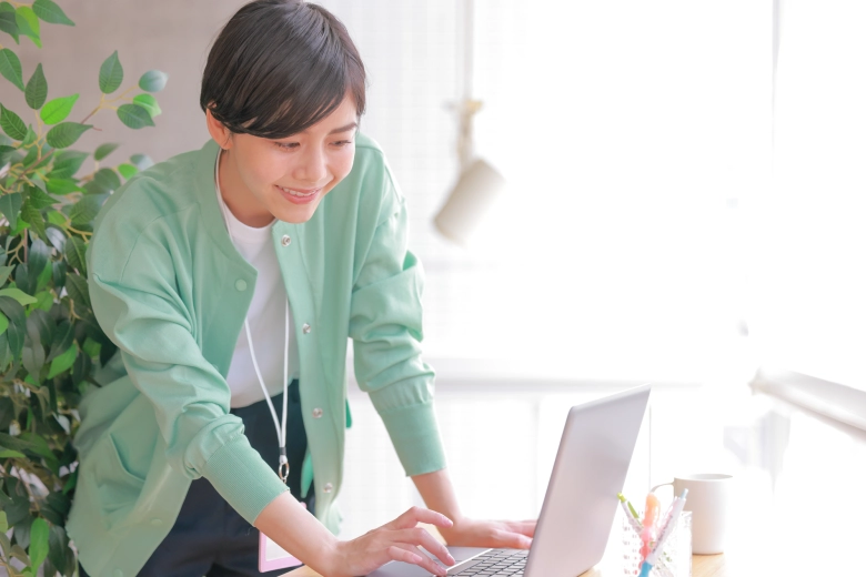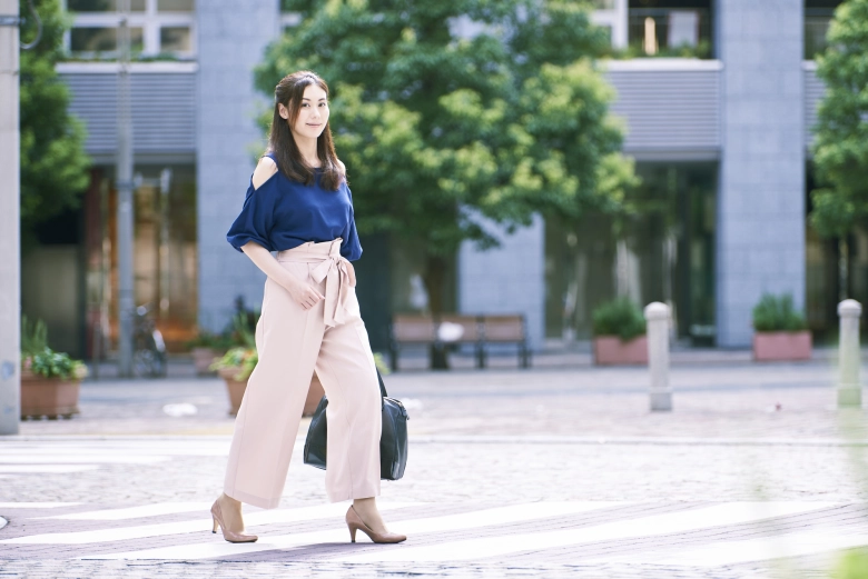 こちらは、ネイビーのパンツに白のトップスというオフィスでは定番の組み合わせに、ミントのカーディガンをオン。パンツの色のネイビーがミントの明るさを引き立て、全体を穏やかに引き締めています。落ち着きの中にほどよい華やかさが生まれ、オンにもオフにも取り入れやすいバランスのいい着こなしです。