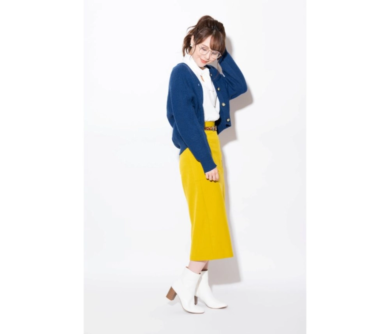 こちらは、ネイビーのショートカーディガンにイエローのロングスカートを合わせたコーディネートです。ネイビーと黄色のみだと色同士のコントラストが強く出すぎてしまうので、緩衝材としてブラウスとショートブーツは白をチョイス。抜け感がありつつ、大人かわいいアクティブな印象にまとまっています。