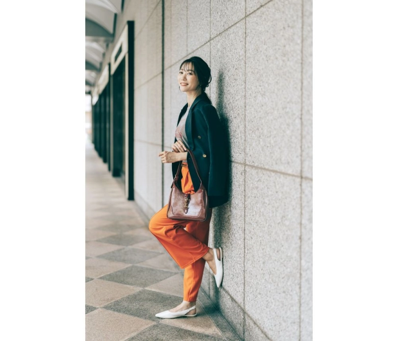 こちらは、オレンジのパンツにネイビーのジャケットを羽織った、アクティブながらも大人の余裕を感じさせるコーデ。知的さをキープしつつ、ほどよく華やかで親しみやすい雰囲気を演出しています。