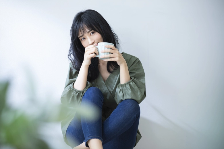 こちらは、オリーブグリーンのようなカーキのトップスにネイビーのデニムを合わせたコーデです。深みのあるネイビーがカーキの持つメンズライクな印象を引き締め、都会的で洗練された雰囲気を演出。細身のデニムで下半身をシャープに見せつつ、トップスの柔らかな質感で女性らしさを添えています。