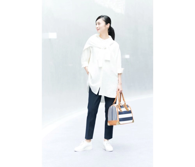 こちらの写真は、センタープレスの入ったネイビーのパンツに、長め丈の白シャツを合わせたコーデ。足元に白のスニーカー、肩に白のカーディガンをかけることで、爽やかさもアップです。