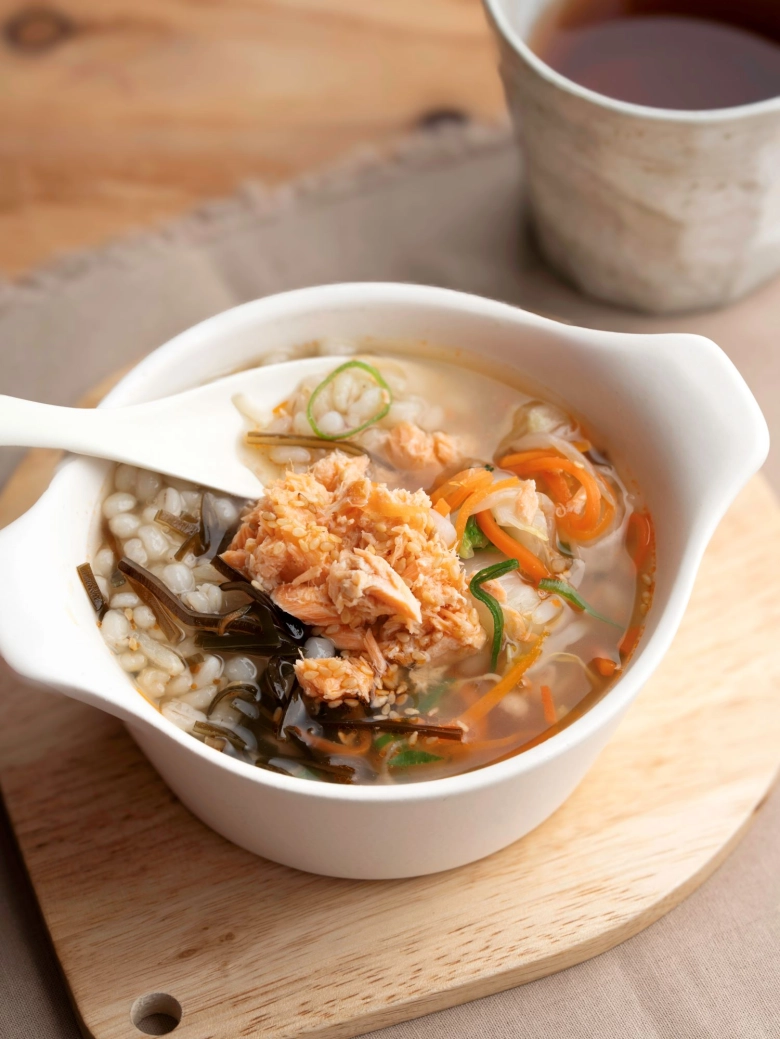 するっと食べられて朝ごはんにもぴったり!「鮭と昆布のあごだしスープご飯」