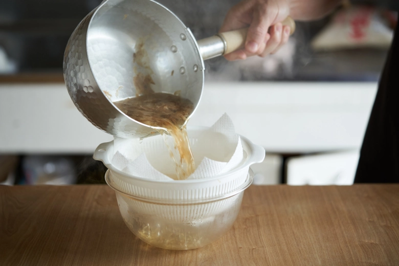 キッチンペーパーを敷いたザルでこし、固形微粒子を取り除いたら完成です。