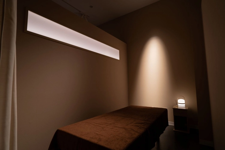 私が行ったのは、『ブレインスリープ コンディショニングスタジオ 二子玉川店』。こちらでは受付をしたら個室に通され、サロン専用のウエアに上下ともに着替えます。初回の施術前には問診入力や、カウンセリングが入ります。完全個室ではありませんが、全体的に静かですし、心地のいい音楽とホッと落ち着くほのかな照明、万年寝不足の私からすると、これだけで爆睡できる環境…いえ、リラックスできる空間です(笑)。