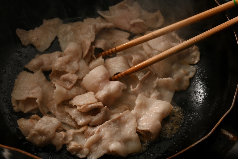 ①に豚バラ薄切り肉を加え、炒めましょう。
