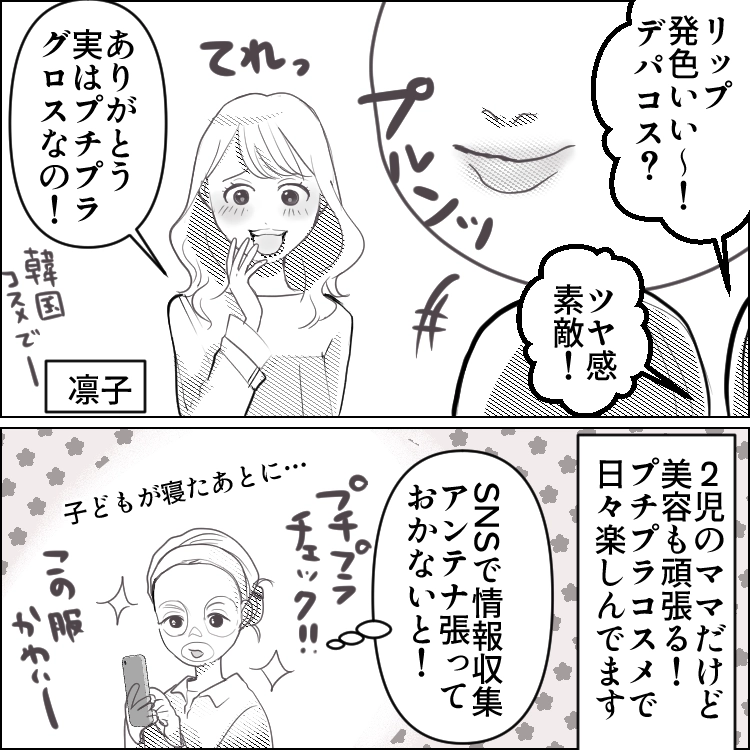 凛子は美容大好き2児のママ。プチプラアイテムを駆使しながら、メイクやおしゃれを日々楽しんでいた。ある日、同じ園に通うママ・かおりさんのリップクリームを拾ったことがきっかけで、会話をするようになった2人。かおりさんは以前から凛子に憧れていたようで、ちょっとずつメイクや服装など、凛子の真似をするように。だんだんとその様子はエスカレートしていき、なんとある日かおりさんが園内で凛子と間違えられることに!?