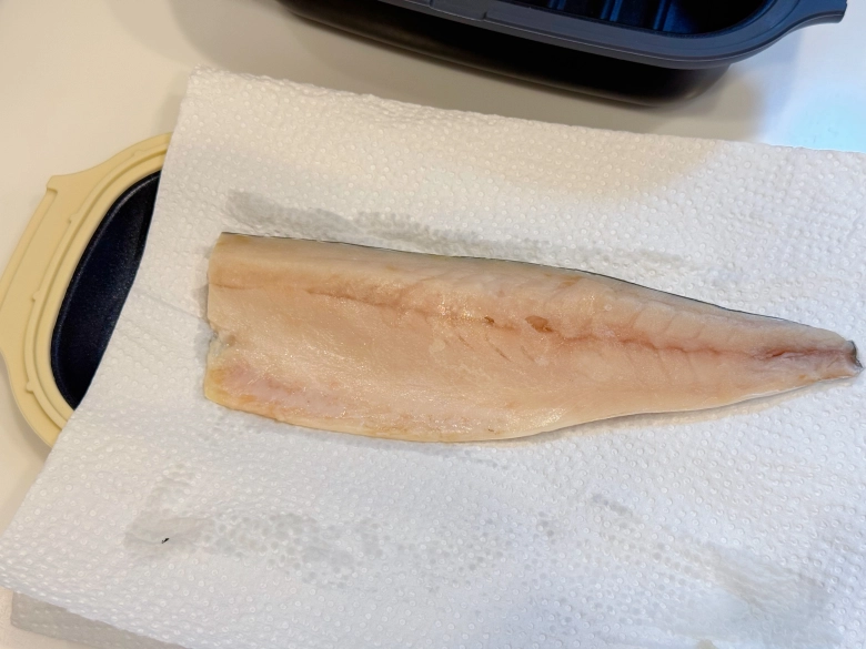 ➀キッチンペーパーで水気を取ります。洗い物が増えるのでまな板は使いたくないため蓋を利用します。