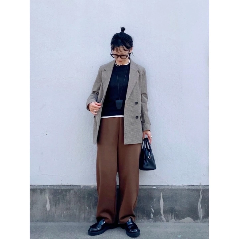 @sizu_oksamさんは、ブラウンのパンツに、同じくブラウン系のダブルブレストチェックジャケットをオン。上下どちらもシルエットにゆとりがありますが、シューズやバッグは黒をセレクトすることでコーデを引き締めています。きれいめなのにがんばりすぎていない、オフィスや保護者会にもなじむコーデの完成です。