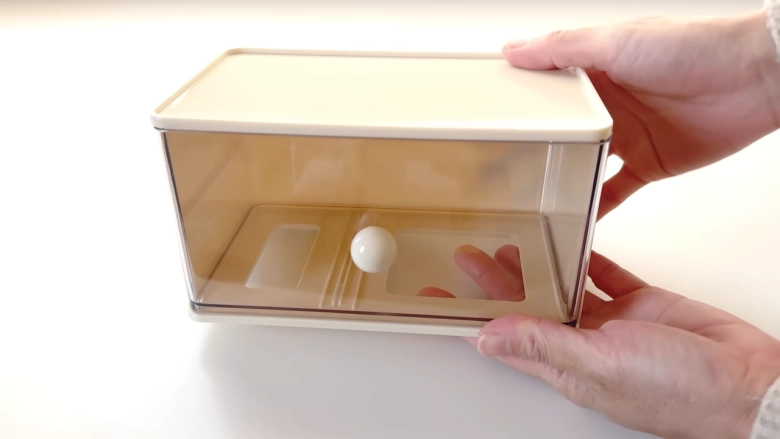 手前に傾いた透明な引き出しが特徴で、ロールメモやフレークシール、クリップのような、かわいい雑貨類の【見せる収納】にぴったり!取り出し口が大きいので、適当に入れても使いやすいのがポイントです。デスク以外では、キッチンなどで紅茶のパックやお菓子などを入れてもかわいくディスプレイできそう♪