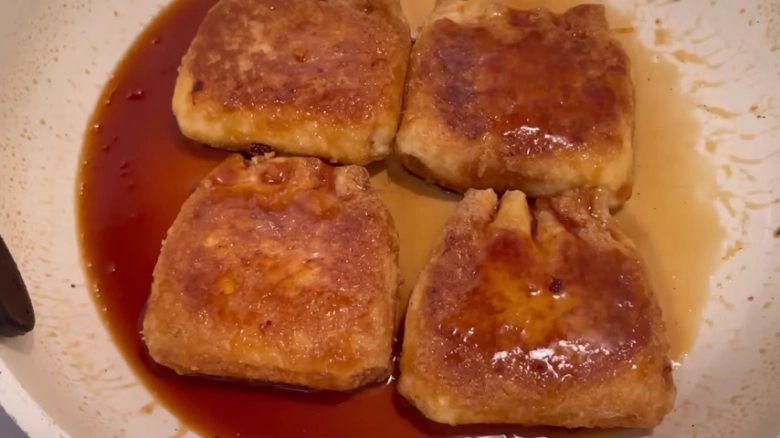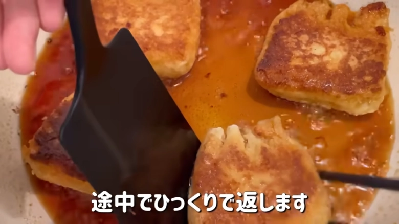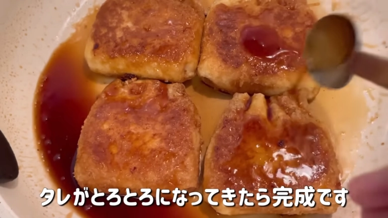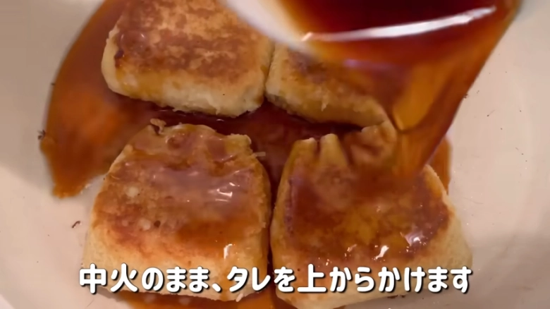 フライパンは中火のまま、巾着の上からタレを回し入れて。