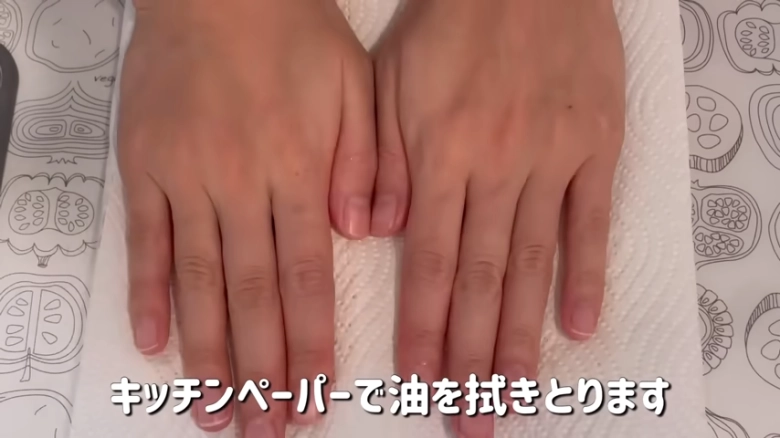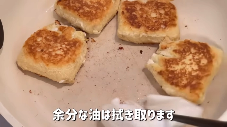ここまできたらフライパンの中の余分な油をキッチンペーパーで拭き取りましょう