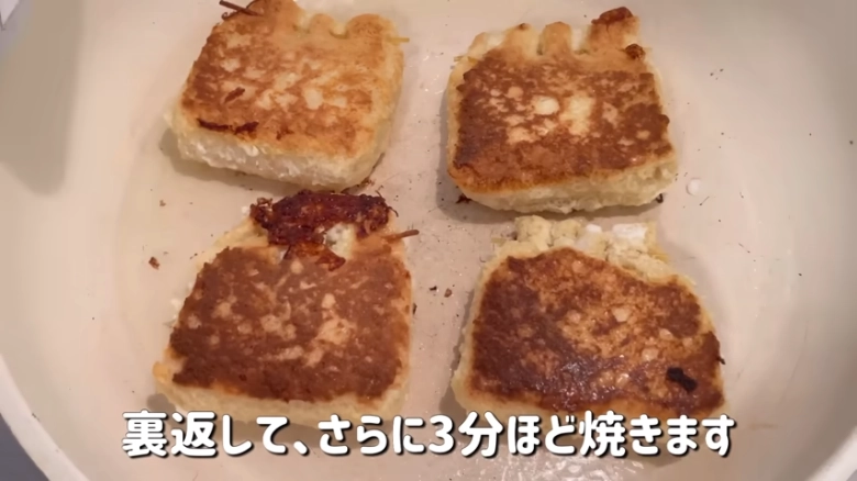 焼き色がついたら巾着を裏返し、さらに3分ほど焼きます。