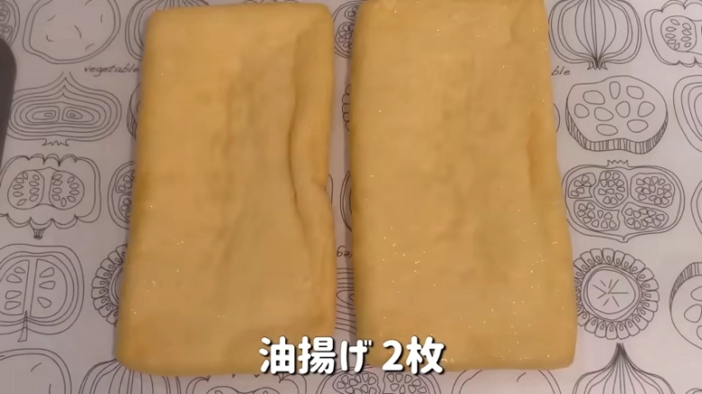 油揚げ2枚とも、キッチンペーパーでしっかり油を拭き取ります。