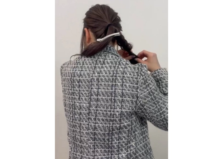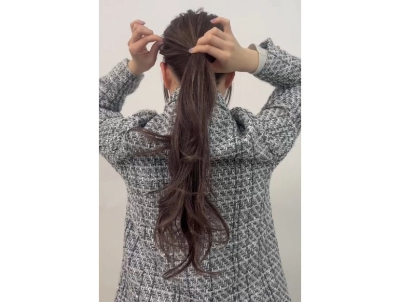 先ほどひとつに結んだ毛束を半分に割り、片方を仮留めします。
