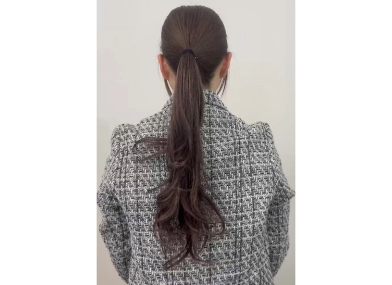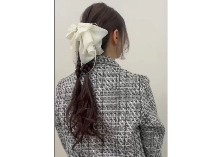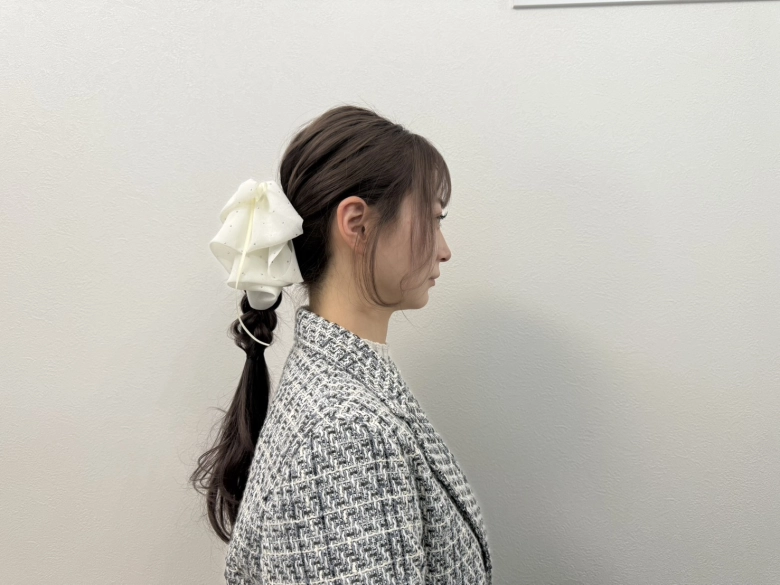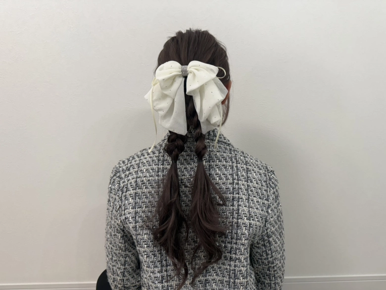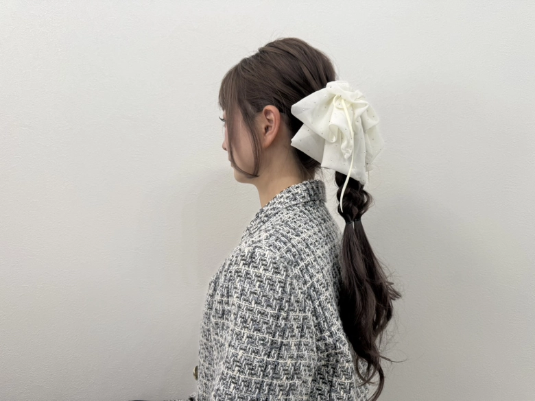 このとき、あまり高い位置に結ぶと、子どもっぽくなってしまうので、耳の位置あたりで結ぶとちょうどいいです♪