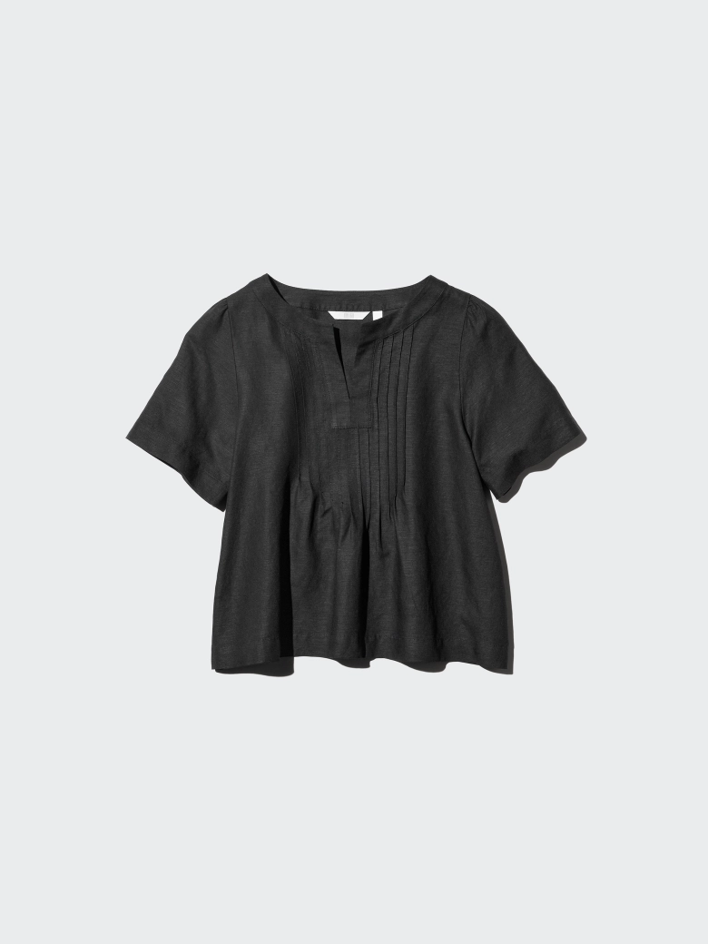 胸元に施されたピンタックのディテール、スリットが入ったキーネックが、顔周りをスッキリと見せてくれます。これならネックレスなしでもおしゃれの手抜き感はゼロ。ストンとしたシルエットのボトムスと合わせやすいAラインになっています。洗濯後に軽くシワを手で伸ばして、日陰に干すだけのイージーケアなのもうれしいですよね。