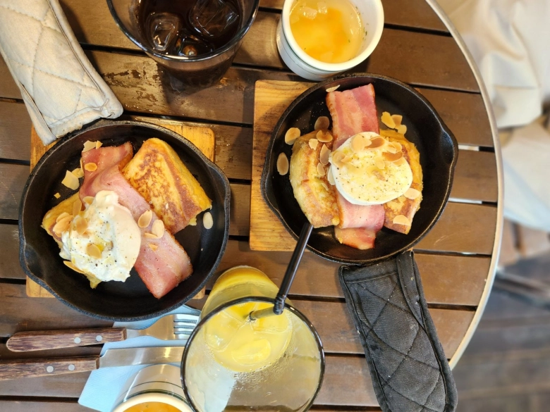 スキレットで提供されるブッターラチーズとベーコンが乗った背徳感たっぷりのフレンチトーストは、ラン後の身体に最高の幸せとなって染みわたります(笑)。 人混みから抜け出し「走ったあとにふっと力を抜く」この瞬間が実はいちばんのご褒美。 このために走っていると言っていいくらいです。