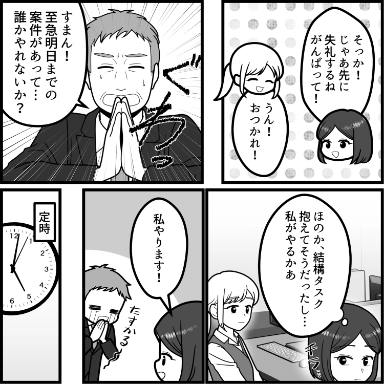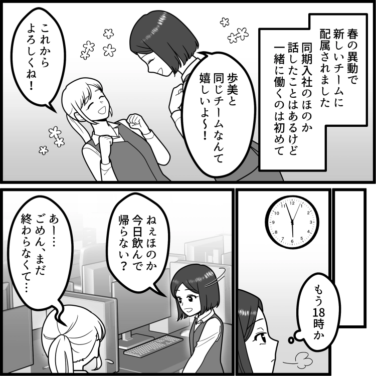 春の異動で新しいチームに配属されて、はじめて同期のほのかと一緒に働くことになった歩美。一緒に働けることに喜ぶ2人だったが、どうやらほのかは業務量が多いのか忙しいようで、歩美の飲みの誘いを断って残業することに。翌日、上司から緊急で対応してもらいたい案件があると告げられ、忙しいほのかのことを考慮して、積極的に仕事を引き受けることにした歩美。しかし、定時が過ぎてほのかと一緒に残業していると、彼女の信じられない一面を目にすることに!?