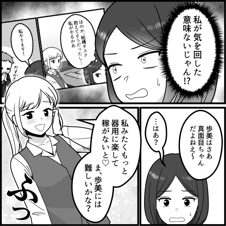 春の異動で新しいチームに配属されて、はじめて同期のほのかと一緒に働くことになった歩美。一緒に働けることに喜ぶ2人だったが、どうやらほのかは業務量が多いのか忙しいようで、歩美の飲みの誘いを断って残業することに。翌日、上司から緊急で対応してもらいたい案件があると告げられ、忙しいほのかのことを考慮して、積極的に仕事を引き受けることにした歩美。しかし、定時が過ぎてほのかと一緒に残業していると、彼女の信じられない一面を目にすることに!?
