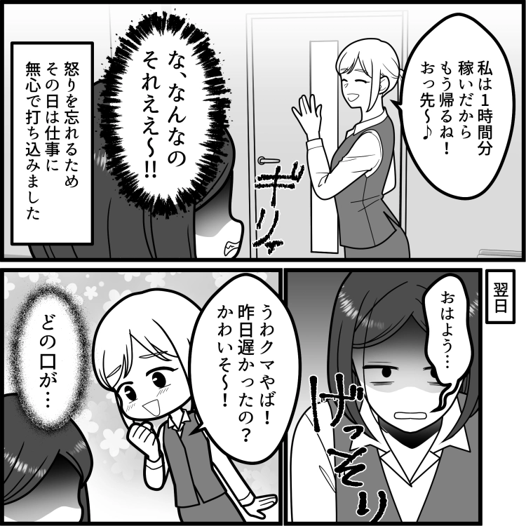 <後編>「今日も残業なんだ!飲みに行けなくてごめんね」毎日残業する同僚。しかし残っていても仕事をする素振りはなく、問い詰めると⇒「え?別にタスクなんてないよw」堂々と言ってきて・・・