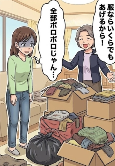 「新品の服なんてお金の無駄よ!」義母が押し付けてくる大量のおさがりは全部ボロボロでゴミ同然⇒「今日はとっておきの物を持ってきたの♪」使用済みの“アレ”まで渡されて・・・