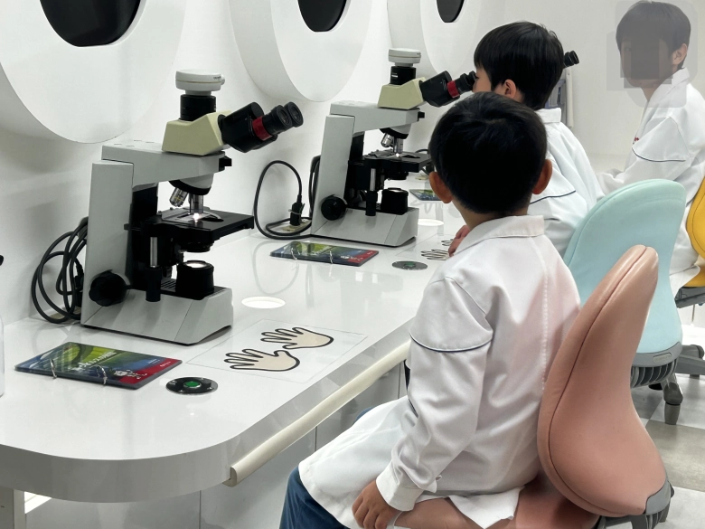 そこからの仕事体験への没入感はさすがのキッザニア。子どもたちが飽きないように作られています。例えば、ビーカーなどの器具を使ったり、顕微鏡をのぞいたり、次男が私を確認することも減ってきていい感じ!