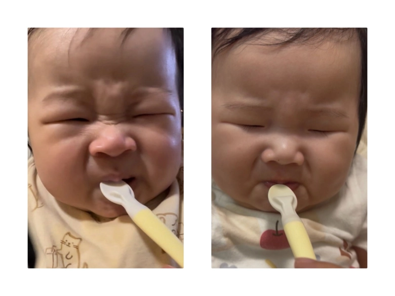 初めてのスプーンの感触に嫌がった顔が、兄妹でおんなじ!