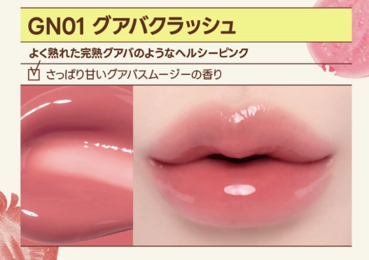 使用しているカラーは「GN01 グアバクラッシュ」というナチュラルなベージュピンク。これ1本で発色と保湿の両方が叶うので、最近は1日中これだけで過ごすことも多いほど愛用しています♪