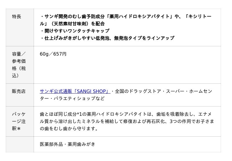 サンギ開発のむし歯予防成分「薬用ハイドロキシアパタイト」配合