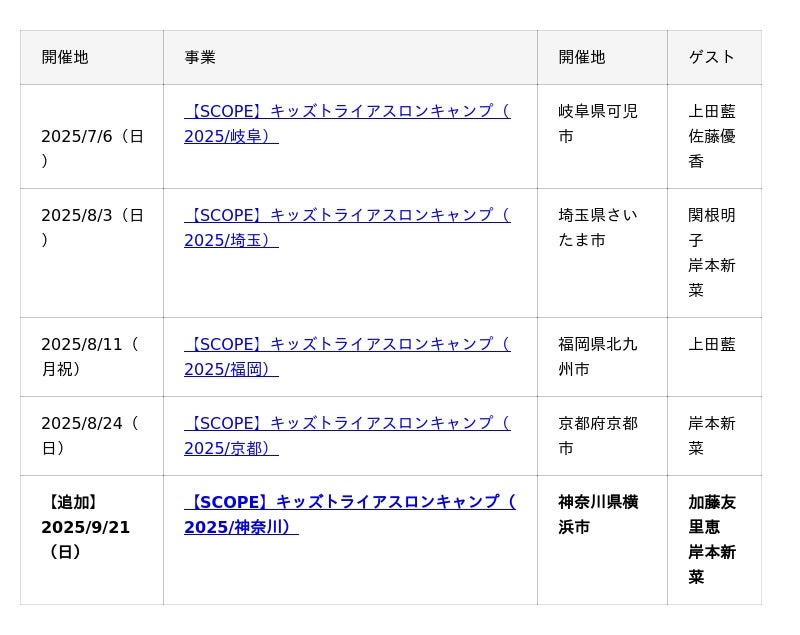 公益社団法人トライアスロンジャパンとオフィシャルパートナーの株式会社SCOグループ(以下「SCOグループ」)は共同で主催する「キッズトライアスロンプロジェクト『SCOPE』supported by SCOグループ」のキッズトライアスロンキャンプの追加開催と特別イベントの会場・日程を決定しました。