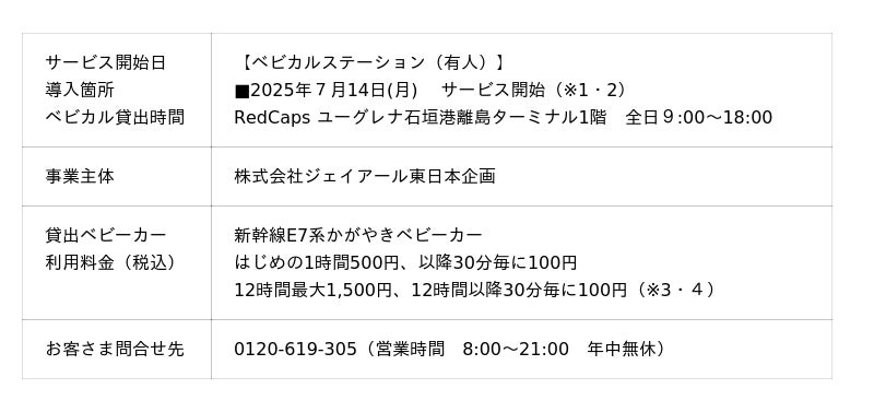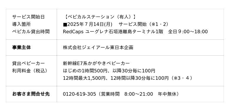 ○この度、株式会社furasucoと連携し、ユーグレナ石垣港離島ターミナルに開業する手荷物当日配送・一時預かりカウンター「RedCaps(レッドキャップス)」で7月14日よりサービスを開始します。ベビーカーは、すでに貸出場所である空港到着ロビーの「RedCaps 南ぬ島 石垣空港国内線ターミナル1階 中央」とともに、お子さまに人気の新幹線型ベビーカーを貸出いたします。